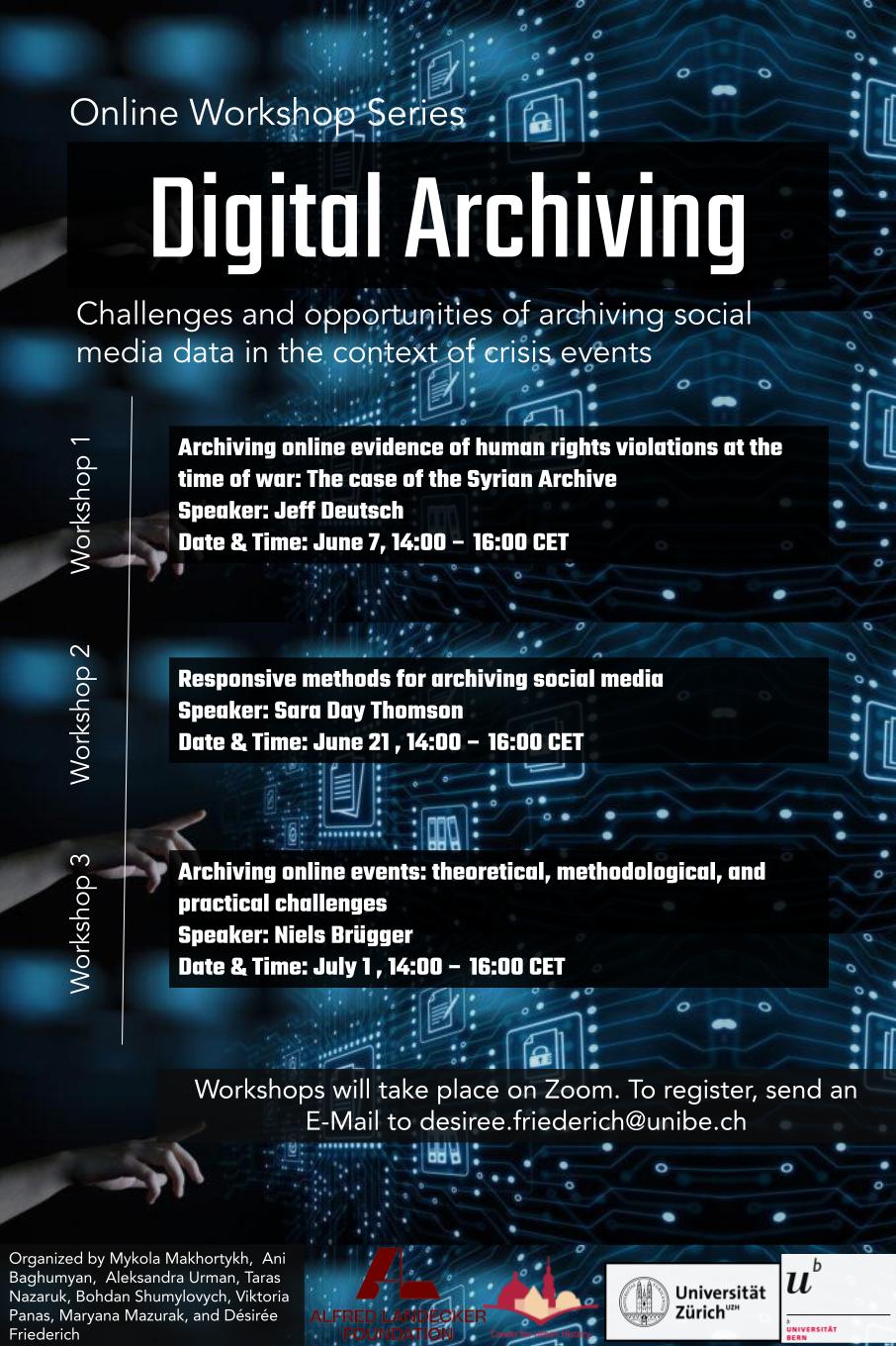 This online workshop series discussing theoretical, methodological and practical aspects of social media archiving, was designed to support an initiative of creating a Telegram archive of the war in Ukraine. The series involves scholars and practitioners who are invited to share their experiences and reflections on social media and web archives of crisis events and armed conflicts. It also creates an opportunity to discuss ethical and methodological challenges for collecting and preserving social media content during the Russian invasion of Ukraine.