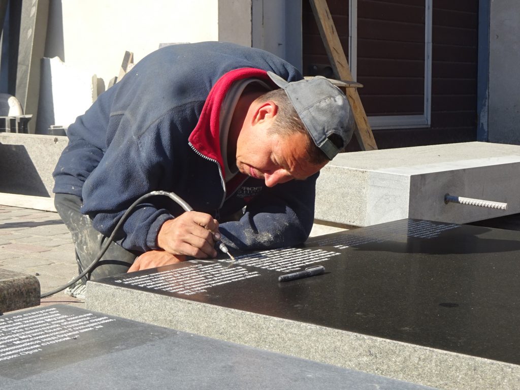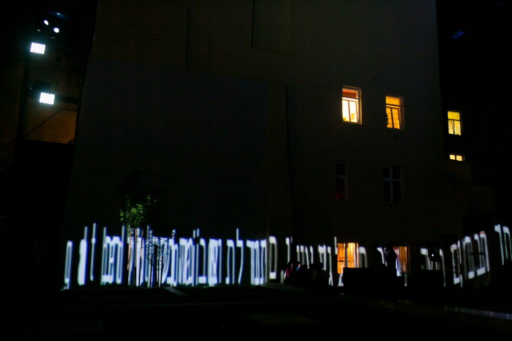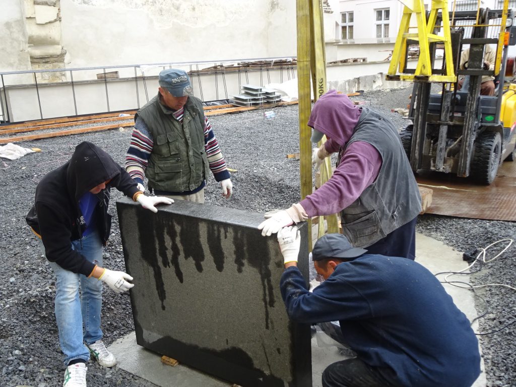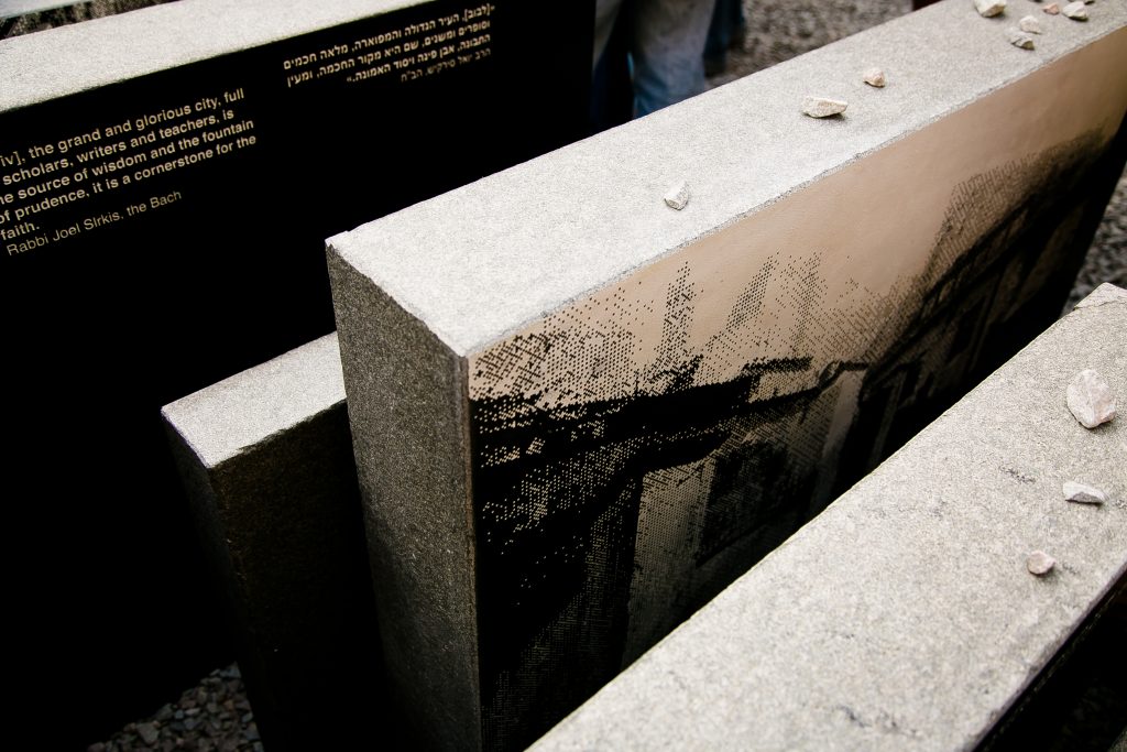 While the project is focusing on spaces of destroyed religious buildings, the Perpetuation Memorial Installation is an attempt to give voice to people who used to live in Lviv, who were Jewish, and who put their thoughts down in writing. This installation is a set of 39 stone plates of different sizes, the majority of which were inscribed with quotations and images taken from photographs. 21 quotations from more than 80 suggestions were selected by us together with members of Jewish organizations and communities in Lviv. The inscriptions came from memoirs and diaries, and the works of rabbis, thinkers, professional writers, and ordinary citizens. Each quotation was presented in its original language, and with translations. Among the authors are famous people and ordinary people, men and women of all ages, and children.