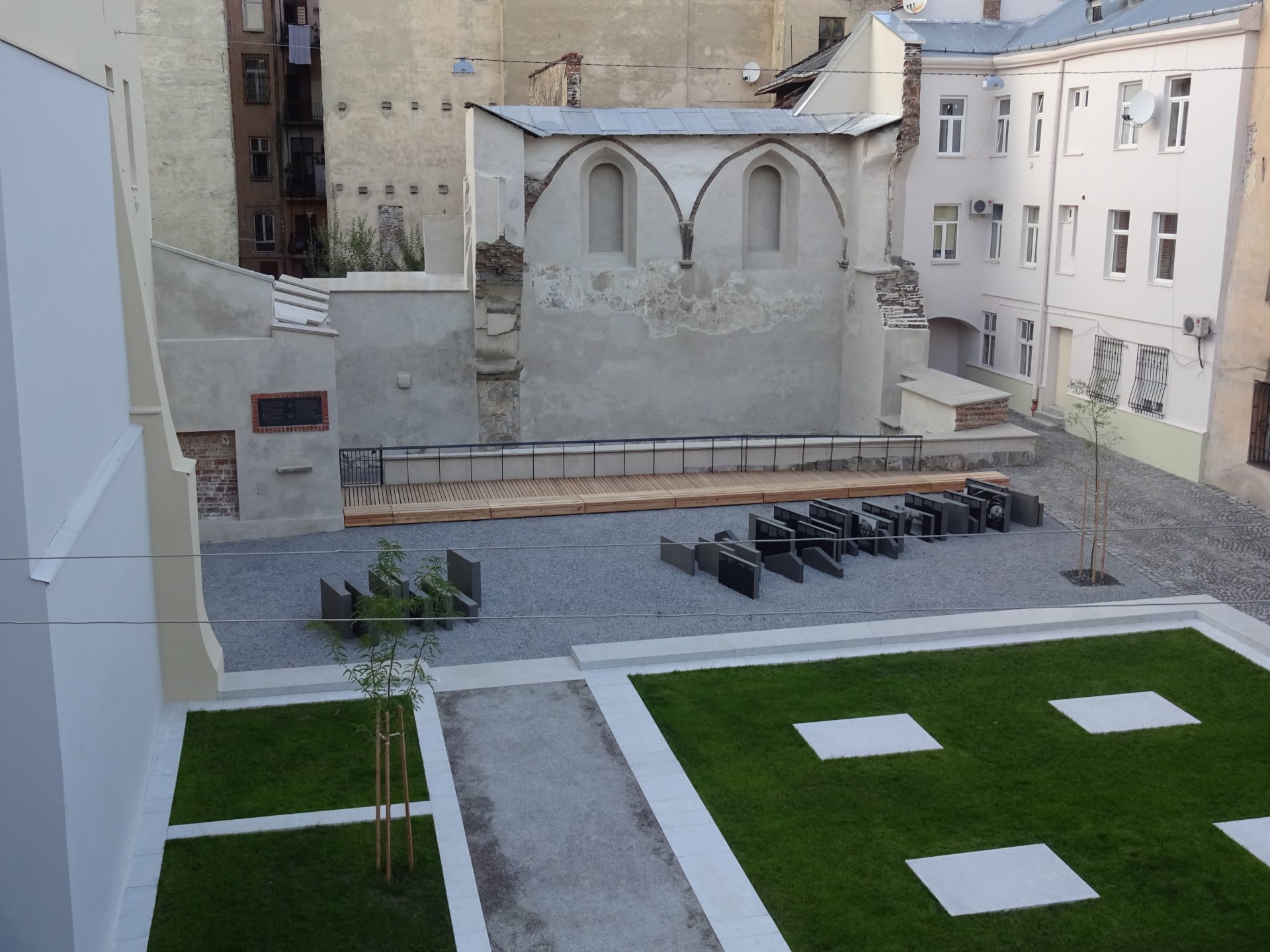 This site became the Space of Synagogues. and It is an attempt to mark and make visible a story of the building destroyed during the Holocaust and the stories of Jewish inhabitants of Lviv and the region who were killed during the Nazi German occupation. The initiative was aimed at changing the situation of the post-war decades when the plots have become symbols of neglect and non-remembrance. In the 2000s part of the space was fenced off the from prying eyes with a huge metal fence, while another part was occupied by summer terraces of the nearby restaurants. The key motto of the project is “Jewish history of Lviv - common heritage and responsibility.” The practical works to implementation of the project started in July 2015 with the exhibition of photographs by Jason Francisco "The Golden Rose". During the period of over a year, the remaining pieces of the Golden Rose synagogue were conserved. Also, the outdoor terrace of the nearby restaurant located on the part of the Beth Hamidrash site was dismantled. The authentic fragment of the Beth Hamidrash foundations was cleared off concrete and marked with "Venezian Terazzo" white stone, a material often used in local construction historically. The Perpetuation memorial installation with the quotes of Lviv citizens and people connected with the city who were Jewish by origin was built.